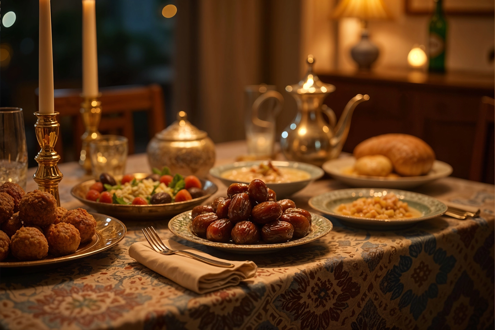 1–2 adet hurma1 bardak su1 kase mercimek çorbası (veya ezogelin)Izgara tavuk / fırında köfte / etli sebze yemeğiYanında az yağlı pilav veya bulgur pilavıMevsim salatası (limon + zeytinyağı az)Yoğurt veya cacık1–2 dilim tam buğday ekmeğiGüllaç / sütlaç