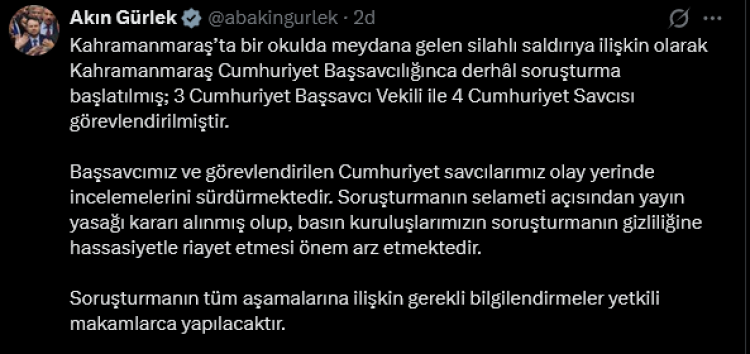 Kahramanmaraş’ta Ayser Çalık Ortaokulu'nda meydana geldiği iddia edilen silahlı saldırıya ilişkin adli süreç başlatıldı. Vali Mükremin Ünlüler, olayda an itibariyle 4 can kaybı ile 20 yaralının olduğunu duyurdu. Yetkililer yayın yasağına dikkat çekerken, resmi açıklamalar dışında bilgi paylaşılmaması istendi. Milli Eğitim Bakanı Yusuf Tekin ile İçişleri Bakanı Mustafa Çiftçi, olay yerine intikal etti.