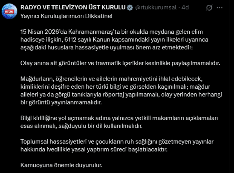 Öte yandan Radyo ve Televizyon Üst Kurulu tarafından yapılan duyuruda, yayıncı kuruluşlara önemli uyarılarda bulunuldu. Açıklamada, olay anına ait görüntülerin ve travmatik içeriklerin paylaşılmaması gerektiği belirtilirken, mağdurların ve ailelerin mahremiyetinin korunmasının altı çizildi. RTÜK ayrıca, bilgi kirliliğinin önüne geçilmesi adına yalnızca yetkili makamların açıklamalarına yer verilmesi gerektiğini vurguladı. Toplumsal hassasiyetleri ve özellikle çocukların ruh sağlığını zedeleyebilecek yayınlara karşı yasal yaptırımların uygulanacağı ifade edildi.