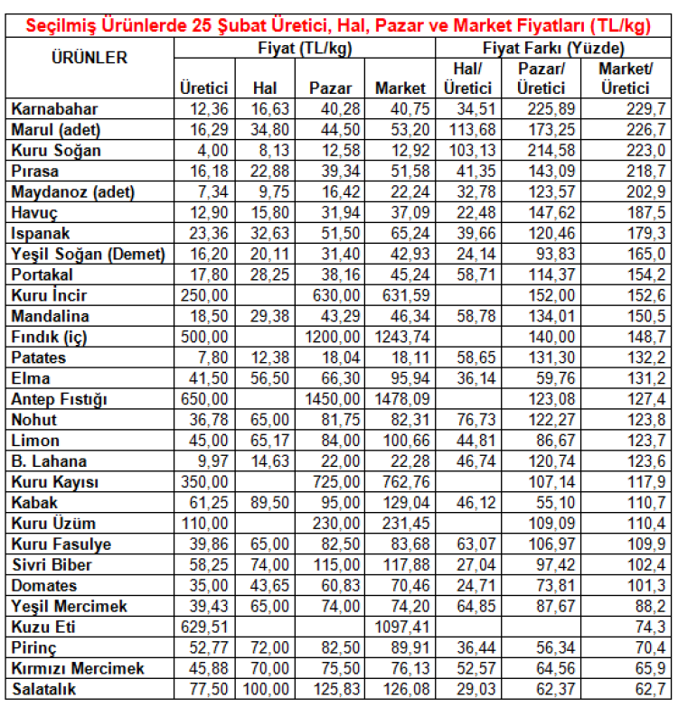 Üreticide 12,36 TL olan karnabahar markette 40,75 TL’ye satıldı. Marulda üretici fiyatı 16,29 TL iken market fiyatı 53,20 TL’ye ulaştı.