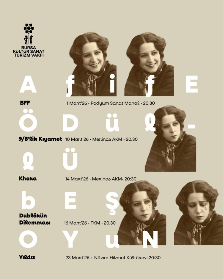 Bursa Büyükşehir Belediyesi ev sahipliğinde, Bursa Kültür Sanat ve Turizm Vakfı (BKSTV) tarafından hazırlanan ‘Afife Tiyatro Günleri’, Mart ayı boyunca Afife Tiyatro Ödülleri’ne layık görülen 5 seçkin oyunu Bursalı sanatseverlerle buluşturuyor. 27 Mart Dünya Tiyatro Günü çerçevesinde gerçekleştirilen özel seçkide, çağdaş, nitelikli ve etkileyici sahne yapımları izleyici karşısına çıkacak.