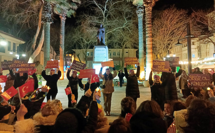 Mudanya Kent Konseyi Kadın Meclisi Başkanı Sevda Demirci’nin öncülüğünde düzenlenen etkinlikte, oluşturulan “8” rakamının içinde ellerinde ışıklarla sessizce durdular.
