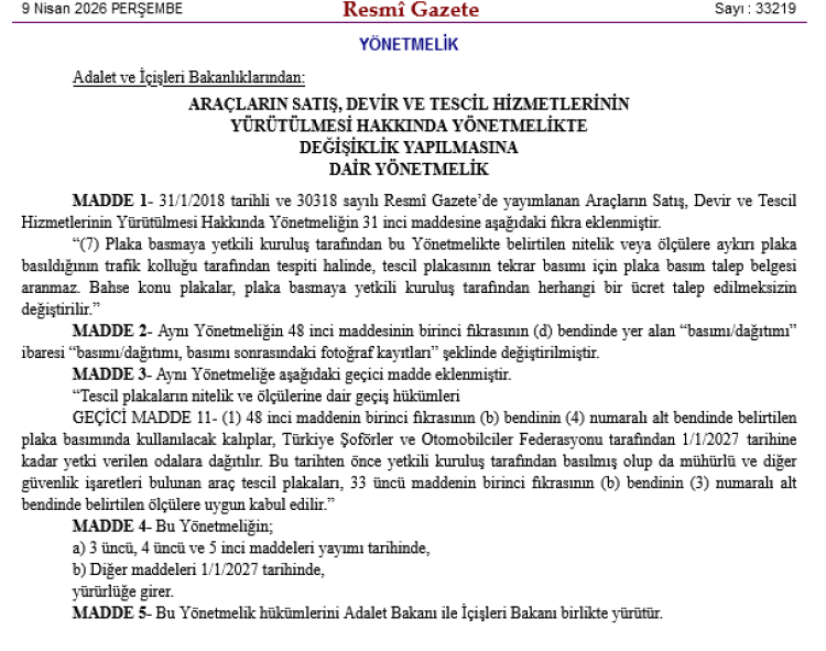 Düzenleme kapsamında ayrıca geçiş sürecine ilişkin hükümler de belirlendi. Plaka basımında kullanılacak yeni kalıpların, Türkiye Şoförler ve Otomobilciler Federasyonu tarafından 1 Ocak 2027’ye kadar ilgili odalara dağıtılması öngörüldü. Bu tarihten önce basılmış ve gerekli güvenlik işaretlerini taşıyan plakalar ise geçerli sayılmaya devam edecek.