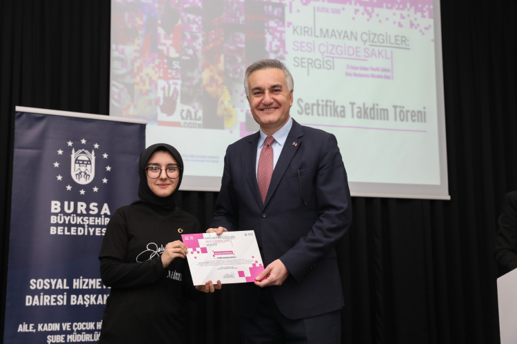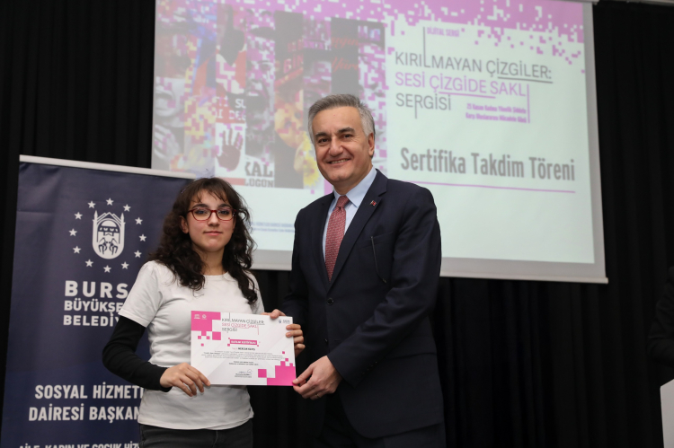 Bursa Büyükşehir Belediyesi tarafından düzenlenen ‘Kırılmayan Çizgiler: Sesi Çizgide Saklı’ dijital afiş sergisine katkı sunan öğrencilere sertifikaları verildi.